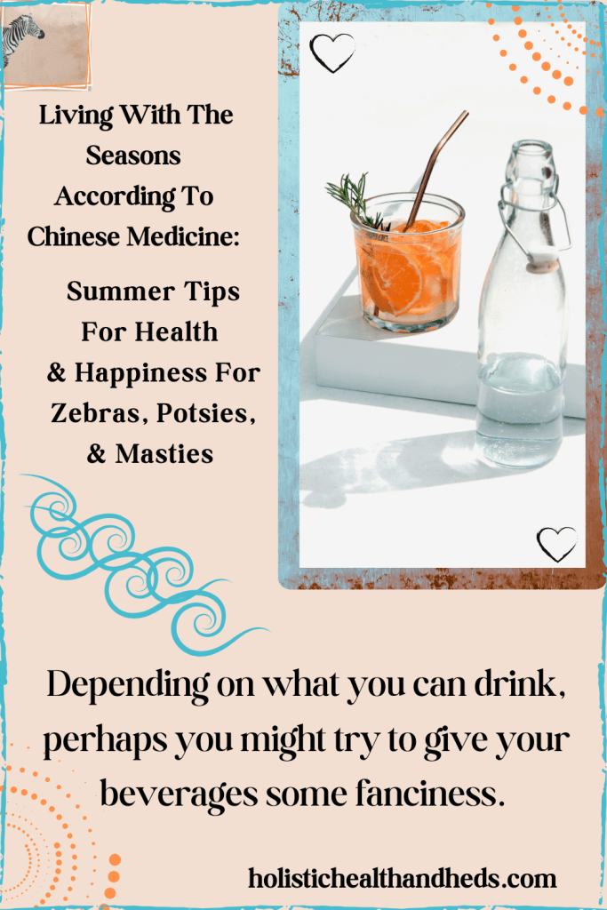 Keeping a steady mood can help you to find greater peace during hot weather. Ways to do so can include waking up earlier and going to bed later. It can be good to rest at midday when the heat is at its highest. Acupuncture can help to regulate body temperature, btw (you do have an acupuncturist in your life, don’t you?). Water mitigates the element of Fire intrinsic to the season, so swimming or taking a cool bath or shower may also help you to feel good. What about soaking your feet in a cool basin if a bath or shower is overwhelming?3