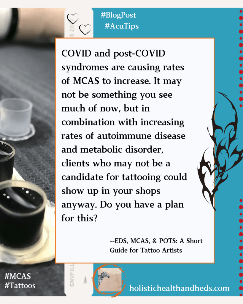 Please be sure to carefully read the section of MCAS in the companion piece to this essay (“Tattoos When You Have hEDS, MCAS, &/or POTS? (It’s Complicated)“) for more information on MCAS and tattoos.