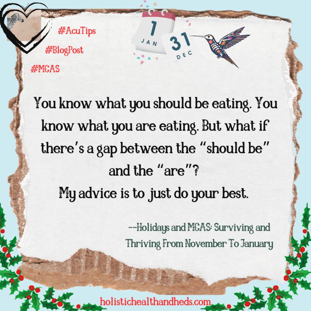 I’ve seen a couple blog posts written by licensed medical care providers on how to survive the holidays. One really left me with my eyebrows raised up to the crown of my skull. The post had good information but it was material that most masties already know in terms of what to eat or what not to eat. And the part where the doctor (the author is an MD) lectured about how people with MCAS need to eat “nutrient-dense whole foods” chapped my hide. I was honestly offended by their descriptors for what kind of poultry and eggs (pasture-raised), meat (grass-fed), and/or fish (wild-caught) that folks should be eating as part of their “nutrient-dense whole foods” diet if they want to get through the holidays intact.