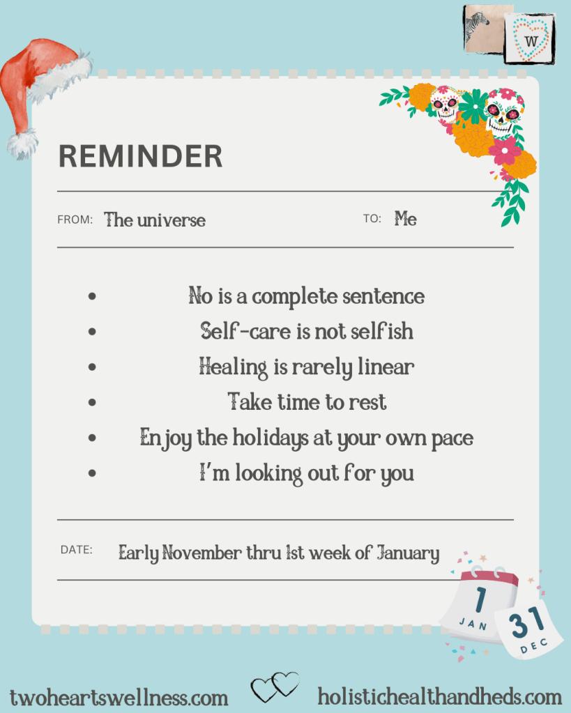 The holiday season will be over before we know it. When we plan, when we take care of ourselves, and when we cut ourselves and others around us some slack, we do better. And if it’s available to us to be grateful for something, no matter how small, or to do a kindness to another, even if it’s just a little thing, then it can be possible to celebrate, and to find joy in the season.
