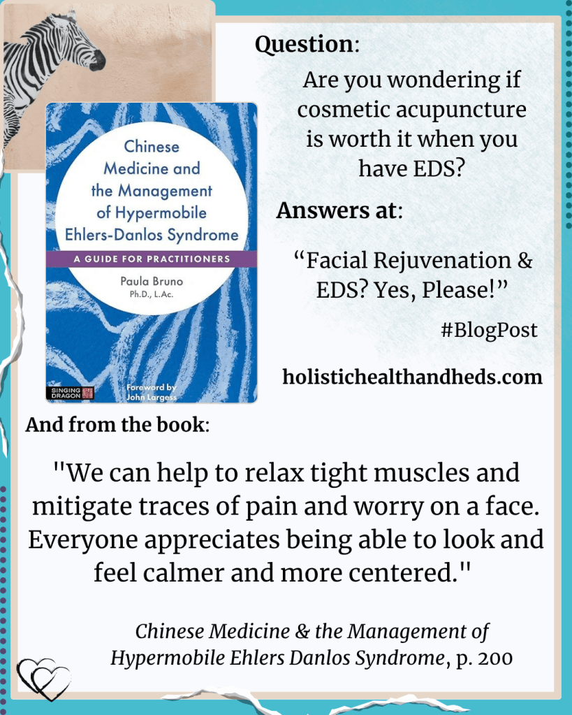 Have you ever wondered about cosmetic acupuncture? Common questions from anyone, whether a normie or a zebra, relate to things like whether or not it’s safe and if it’s worth the investment. We all want to know about that before we plunk down our payment for services rendered. But being a member of the EDS community means that there are extra questions to ask before setting your appointment for an aesthetic treatment. (And this goes for all types of EDS, not just the hypermobile, especially if MCAS and POTS are also in the chat).