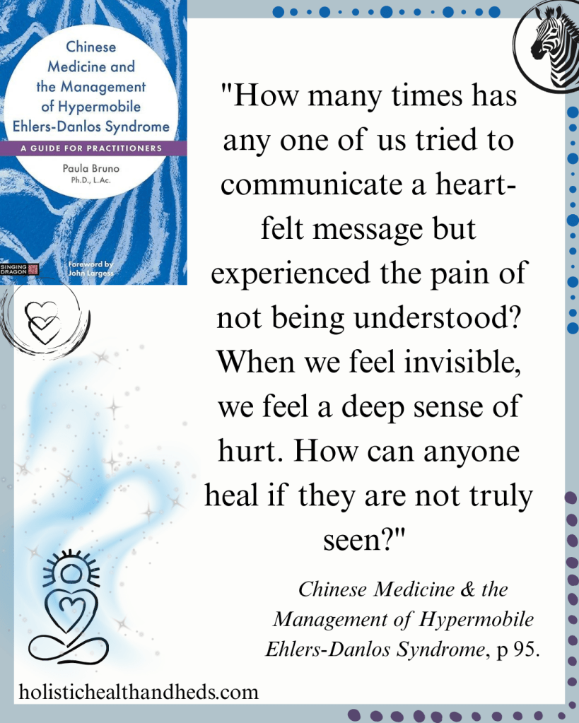 We can’t: First and foremost… your acupuncturist can’t diagnose you. Depending on the state where they’re licensed, they may be able to be your primary care provider (this is true for Florida, New Mexico, and California), but even then… And in Texas, where I am, we identify syndromes according to Chinese medicine but do not diagnose anything from a Western perspective. In my practice, because I treat so many EDS patients, I can give you my seasoned professional perspective on what you may “have.” I can also map out your signs and symptoms and help you to put together your case for your MD if, in fact, you want a diagnosis. It’s not a firm diagnosis that can go into your electronic health record, but this type of support can be tremendously encouraging and sometimes extremely useful. So…