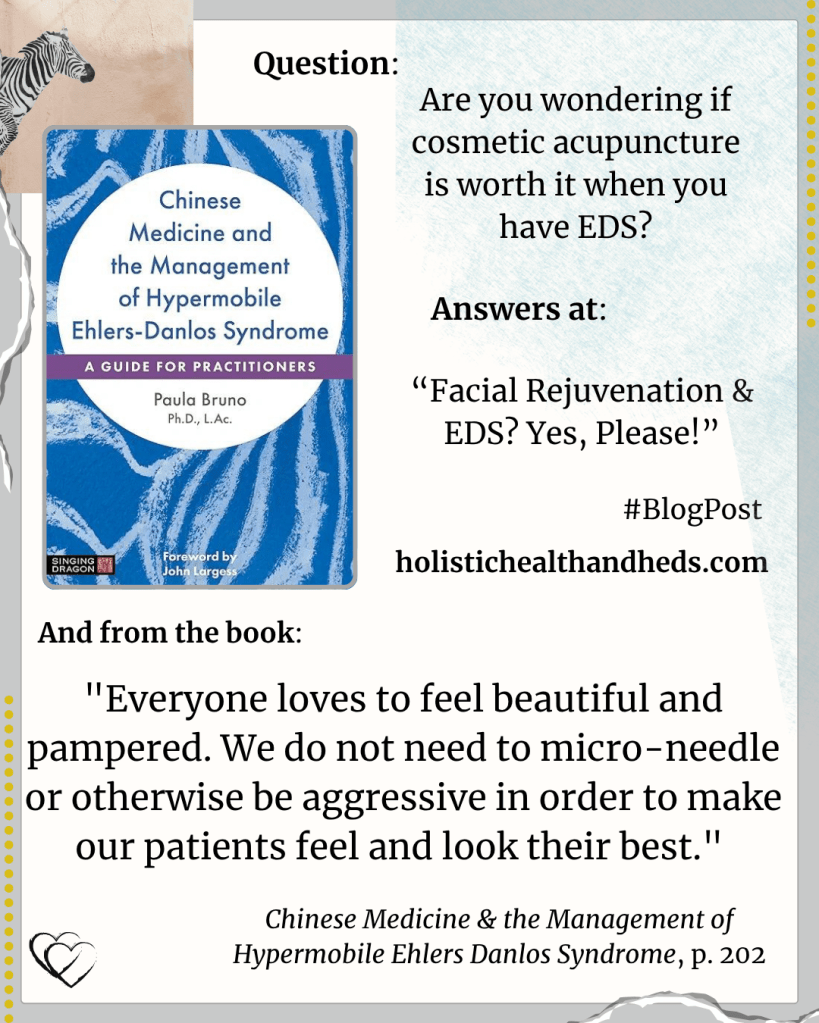Self-care can include cosmetic treatments too. Take a look at the blog post and I also discuss the topic in Chinese Medicine and the Management of Hypermobile Ehlers-Danlos Syndrome: