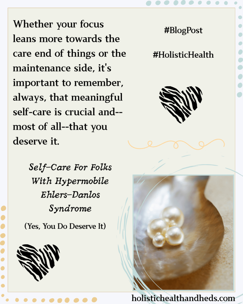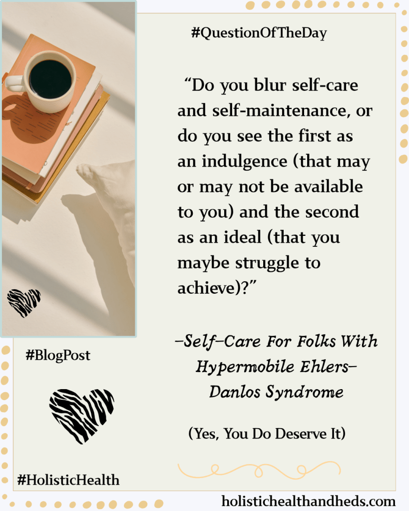The occasional mani-pedi as a treat or the facial or other special something is just as valid for people with the trifecta as it is for a person whose most pressing health concern is an occasional cold or a patch of situational fatigue or anxiety. Everyone deserves fun and treats, no doubt about it, but the more frivolous or superficial versions of self-care don’t always address the genuine needs of a person with hEDS, MCAS, and/or POTS. On top of that…when we live with chronic conditions, we often already feel guilty for the amount of time we spend on the self-maintenance that is absolutely necessary if we want to get through our day relatively intact.