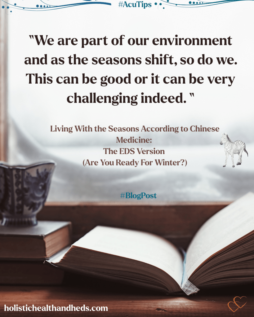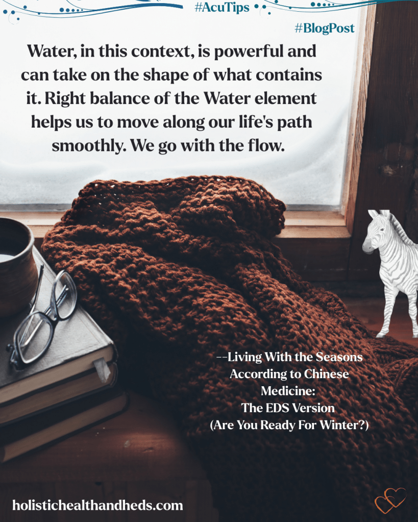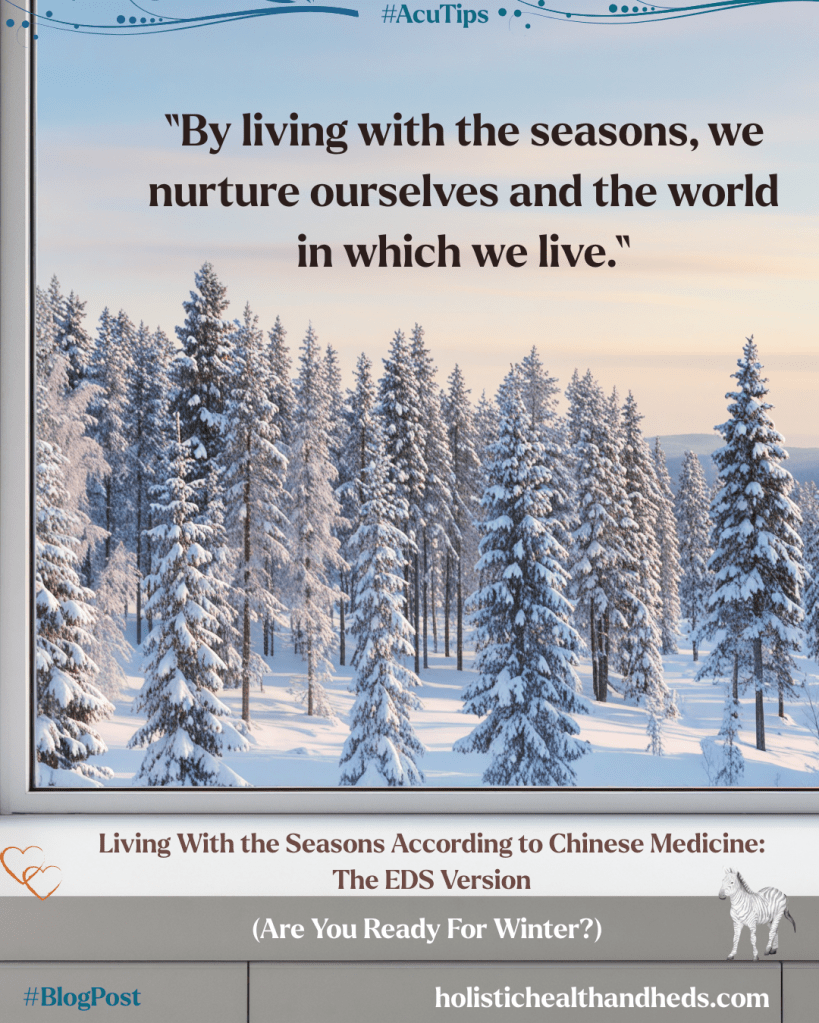 What about you? How do you feel when fall gives way to winter? Do you live in a region that has a season worthy of the name? (I ask because I’m in Texas and we have either mild, non-winters… or, depending, ice storms and mass electricity loss that leaves us without power for a week or more).1 No matter where you live, though, you can strategize ways to live with the seasons rather than against them. And, as a practitioner of Chinese medicine, of course I have thoughts on how to live seasonally when you live year-round with a chronic condition like EDS and the comorbids.
