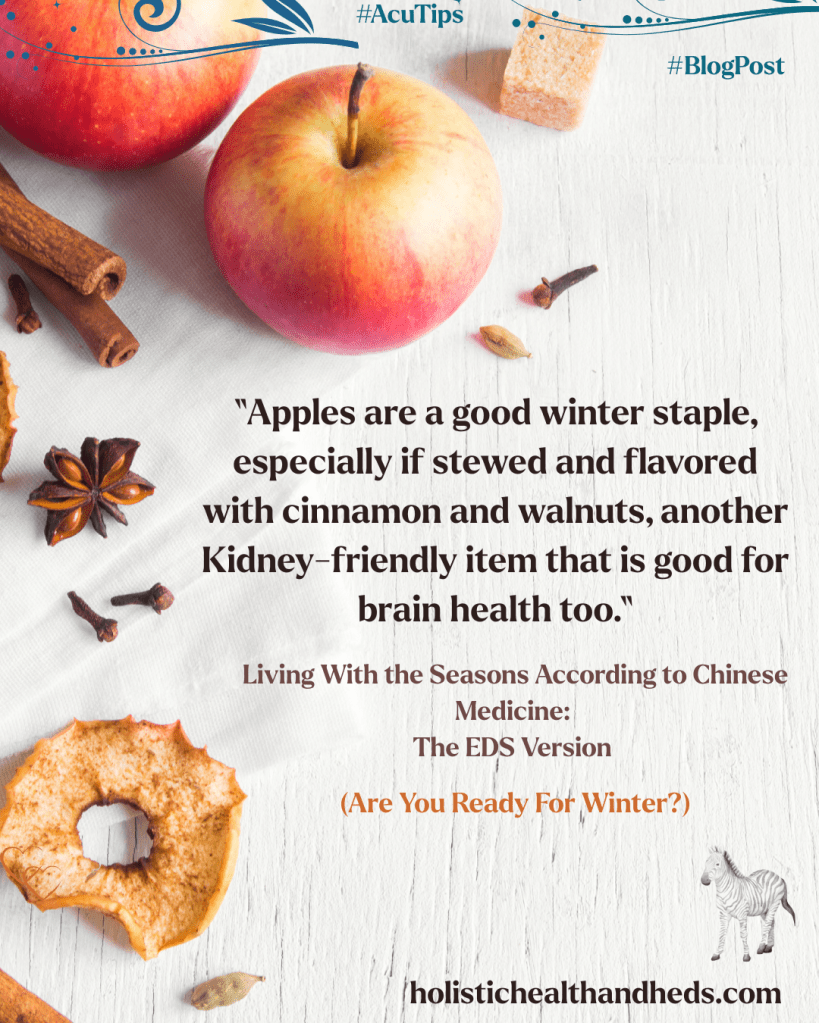 One of the very best ways to take good care during winter is by eating seasonally. We also want to eat stews and soups to nurture our inner heat. Root vegetables are a great choice, as are dark, leafy greens. Brown rice is a worthy option, as are oats and barley. I, personally, love millet but if you have hypothyroidism you will want to avoid this one. Apples are a good winter staple, especially if stewed and flavored with cinnamon and walnuts, another Kidney-friendly item that is good for brain health too.