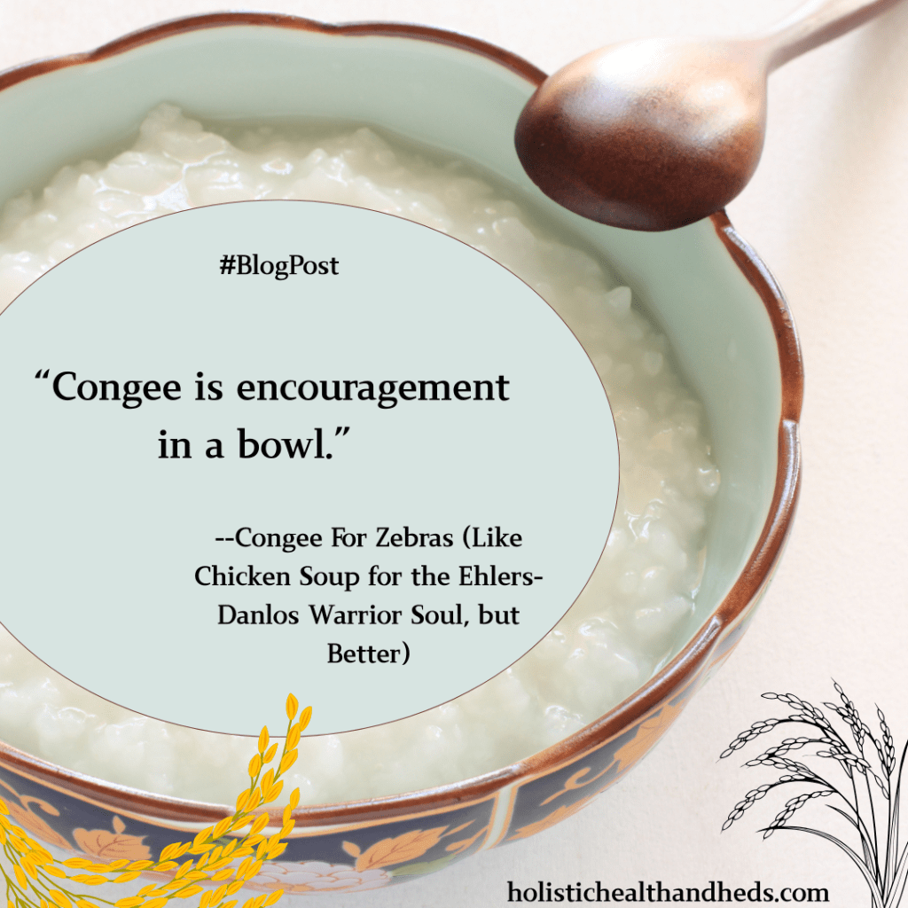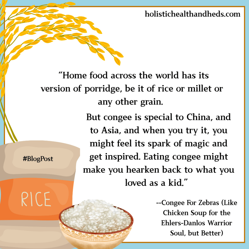 Congee is good for all people and Chinese cooks are rightfully proud of this wonderful, healing, homely food. People with EDS and the common comorbidities, especially, can benefit from adding it to their repertoire. If you want to go along with the precepts of Chinese medicine? Well, keep in mind that food and gut health are cornerstones of the practice. If you’ve never tried congee, maybe now’s the time. In so doing, you can practice meaningful self-care and–always a good thing–open your horizons to new and possibly deeply-healing new avenues.