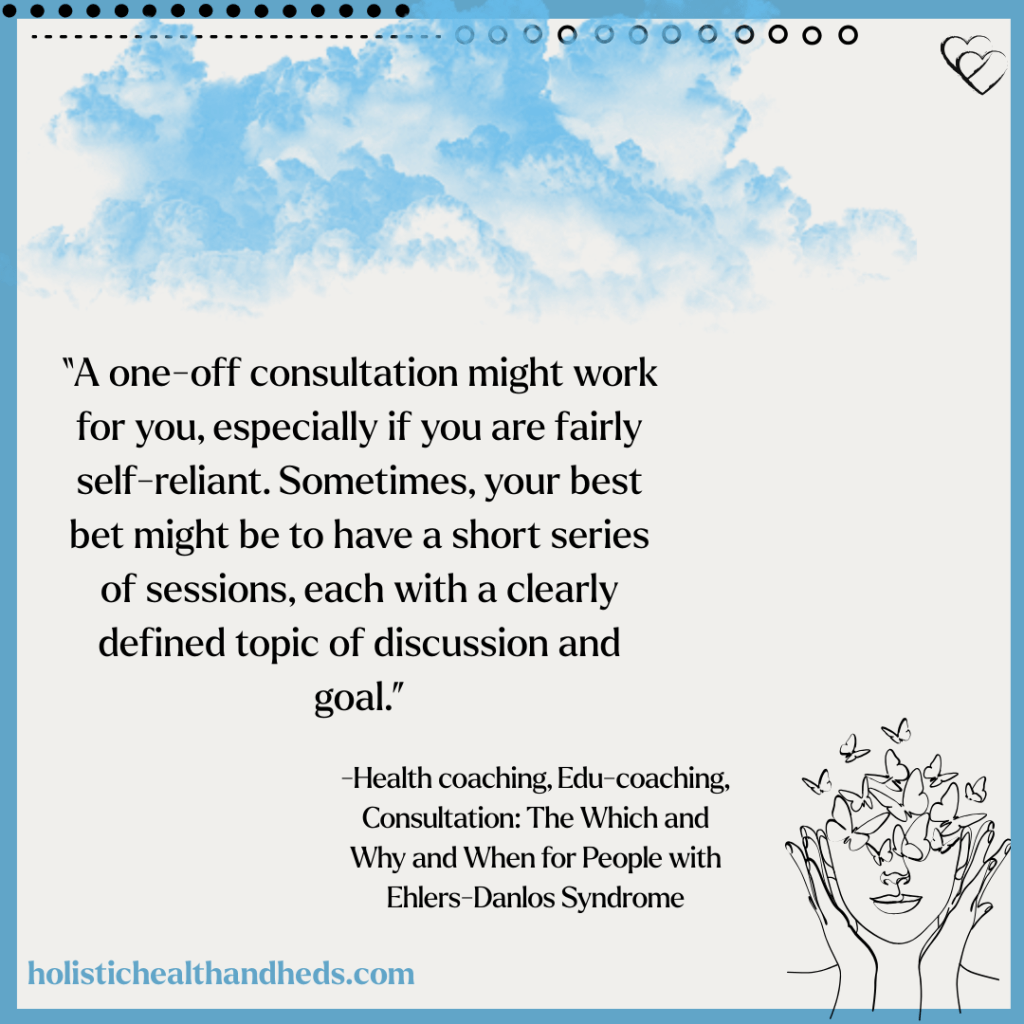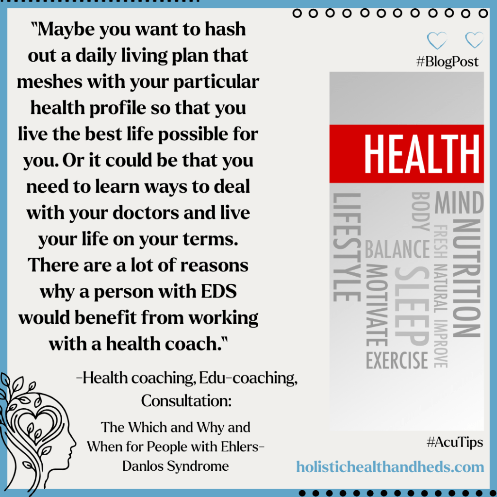 Maybe you want to hash out a daily living plan that meshes with your particular health profile so that you live the best life possible for you. Or it could be that you need to learn ways to deal with your doctors and live your life on your terms. There are a lot of reasons why a person with EDS would benefit from working with a health coach.