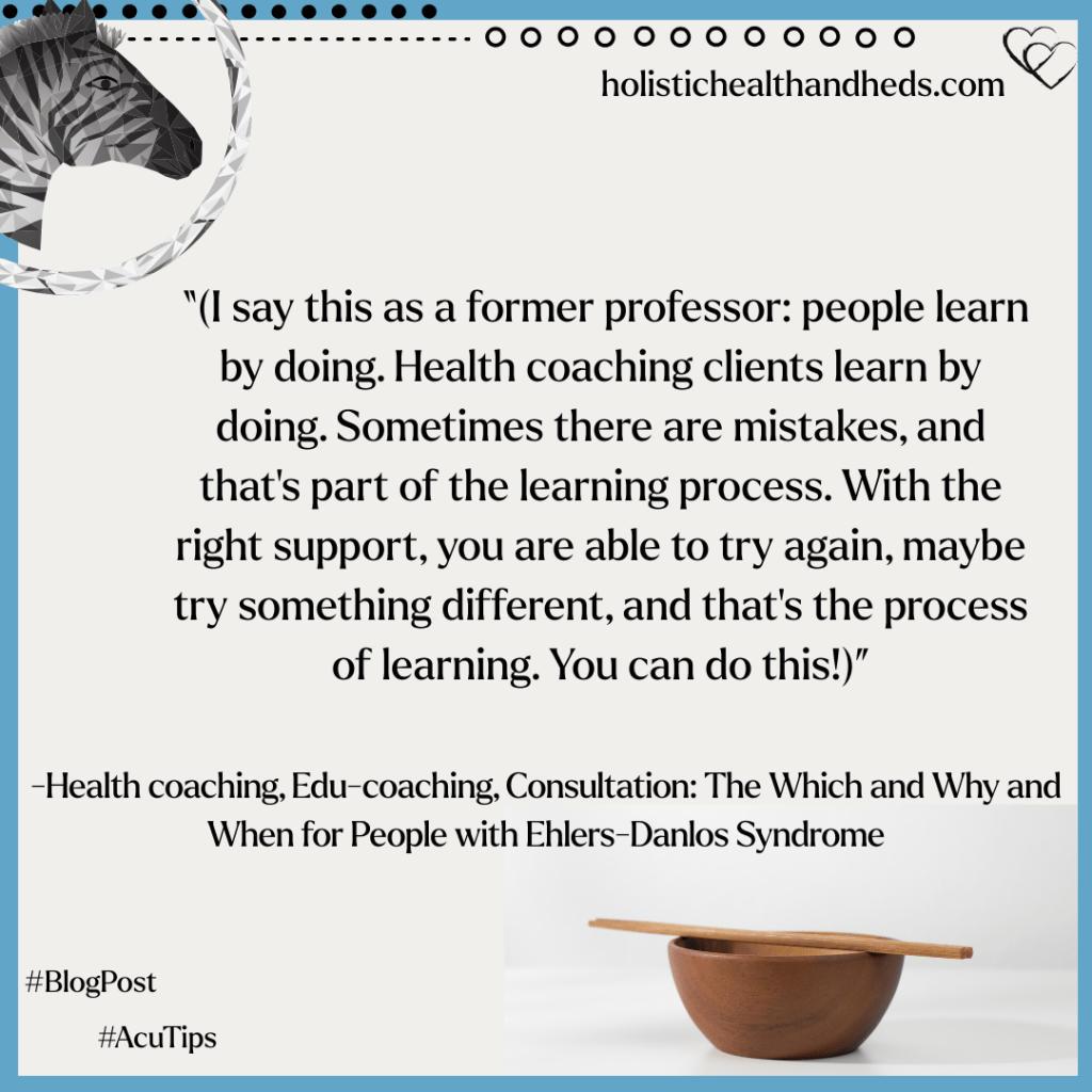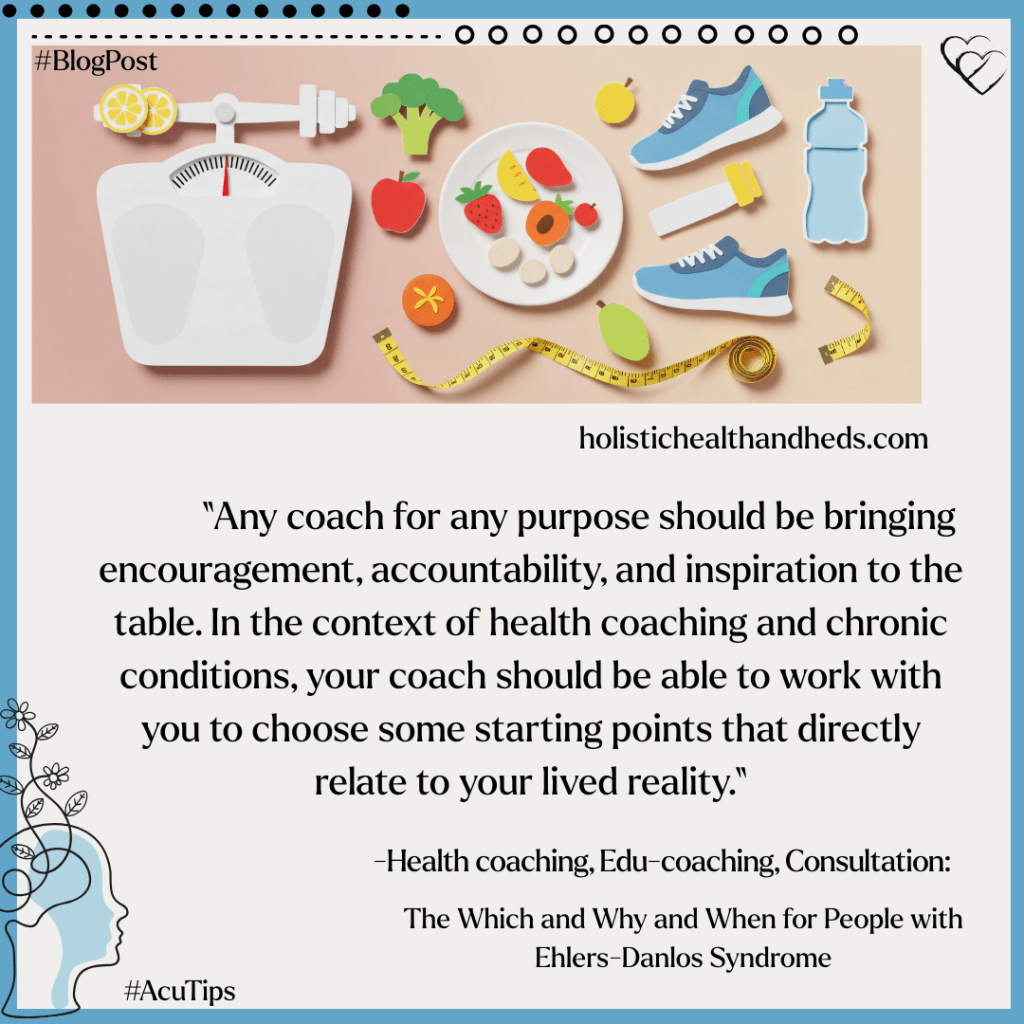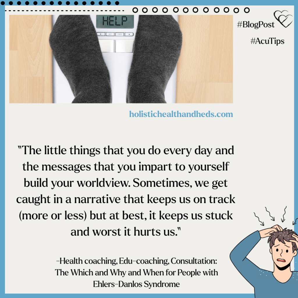 A person with EDS (and when I say this, I mean EDS and comorbid conditions if there are any) might want to work with a health coach for weight loss. It could be that you want some nutrition guidance or to learn how to put into action a diet program your MD has given you. But that’s not the only reason to work with a health coach, especially when there may be other more important issues to consider.