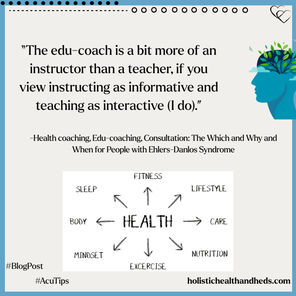 Edu-coaching, consequently, is a bit more akin to mentoring or teaching than health coaching, which aims to draw out of you what you already know and can do and strategize according to strengths. The coach is a bit more of an instructor than a teacher, if you view instructing as informative and teaching as interactive (I do).