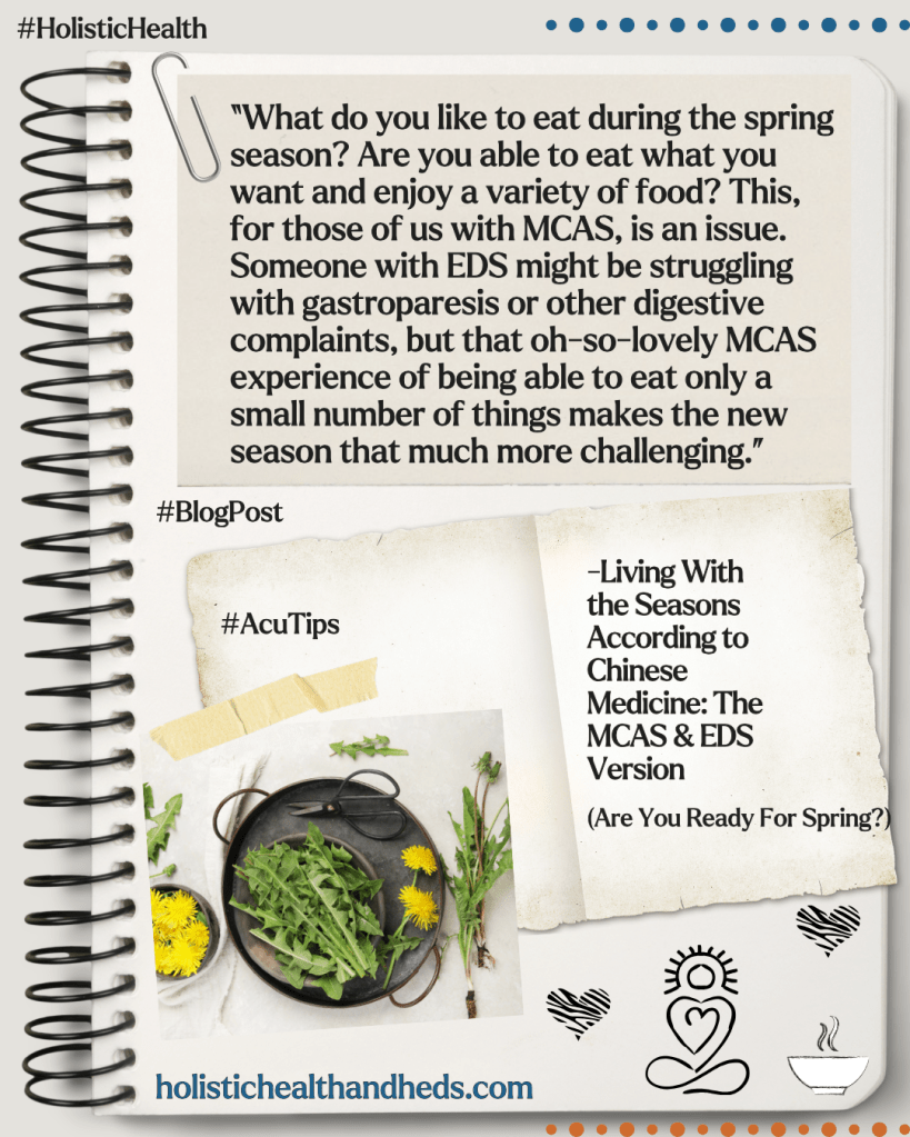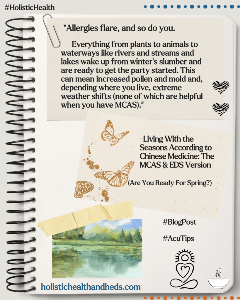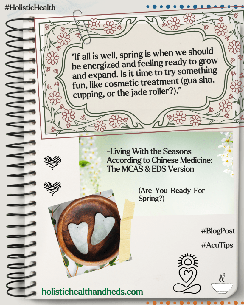 Your acupuncturist can help you with Liver health. For anyone with EDS the benefit to tendons and mood can be worthwhile. For issues that are relatively common for people with MCAS, like floaters, the Chinese medicine approach to Liver health can be a resource. And as to the Gallbladder? Well, who wouldn’t want to boost their energy and drive to complete tasks and achieve goals? Spring is the time to focus on these organs and to support them so that they support you no matter how bad the pollen count gets.