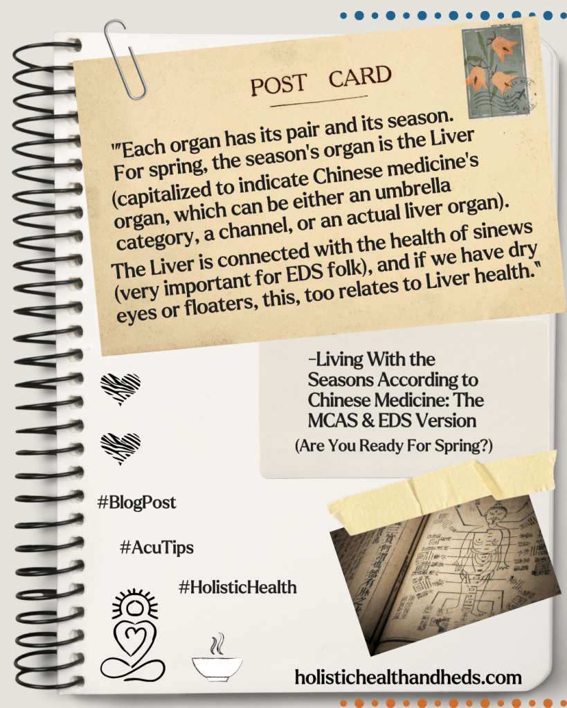 Each organ has its pair and its season. For spring, the season’s organ is the Liver (capitalized to indicate Chinese medicine’s organ, which can be either an umbrella category, a channel (aka meridian), or an actual liver organ. The Liver is connected with the health of sinews (very important for EDS folk), and if we have dry eyes or floaters, this, too relates to Liver health. When Liver qi is stagnant, we feel crabby or even outright angry. Extremes of menstrual cramps also come back to Liver qi stagnation.