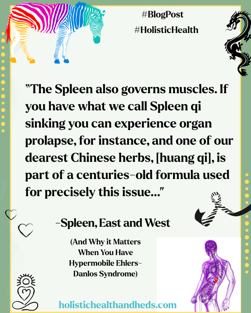 And on a related note? Your Liver, for its part, governs your tendons and sinews. It is another blood filtration system just like your spleen (among the many tasks that your liver performs). Take a look at the companion piece to this blog post that you can find on my main website (Two Hearts Wellness). For us in Chinese medicine, the Liver and the Spleen have quite the interactions and often come up in our assessment of HSD/hEDS patients. When the Liver isn’t working well, it can affect Spleen function and when the Spleen is weak, the Liver can make things very challenging indeed.